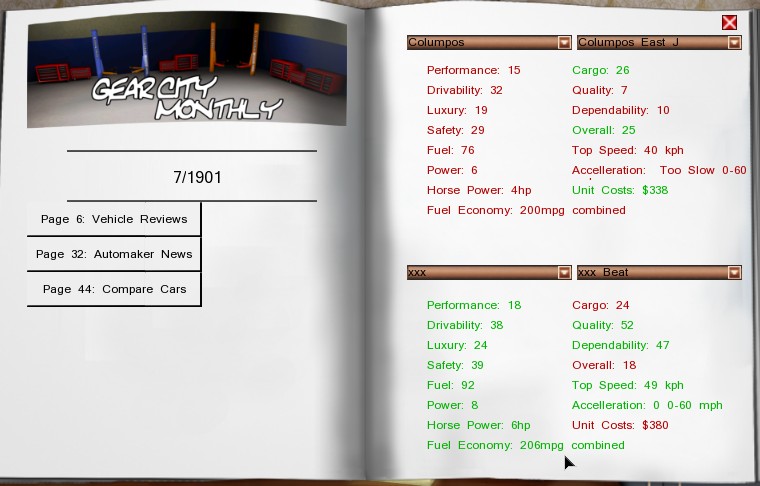 Although it is very early in the game, the situation is comparable to the old save game. I designed a compact car with the main focus for the components and the car itself being fuel efficiency and dependability. According to the components.xml these two factors seem to be the most important ones to potential compact car buyers.