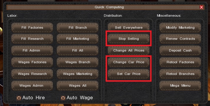 After spending some time in Gearcity i started noticing the Quick computing / distribution menu is not working correctly for me. I can select a model to launch, changing all prices by a percentage is also not a problem. However: if i try to change one model's price ( by setting one, or changing it by a percentage) my requested new sale price is not calculated at the branches. Also, when i try to stop selling a certain model, it will not always work.
