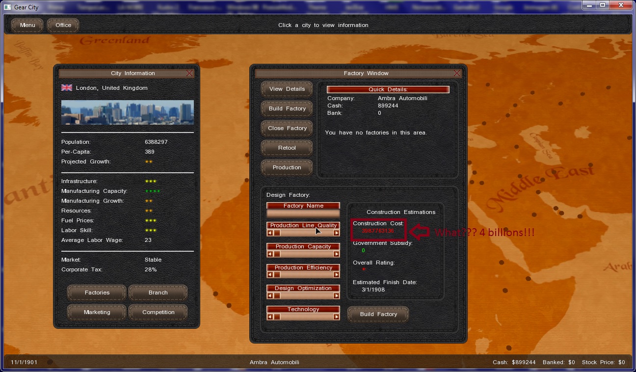 I have reported this, so I think Eric knows, on the side note - have you seen labour costs in London? May be cheaper to produce in Genoa and transport to London to sell? )) .. I personally (so far) have only been starting in France (Paris), and by 1903 I build a 2nd factory in Bordeaux since it seems to have a decent balance for distance, costs, infrustructure etc etc.. Also - I never start my 1st car sales with less then 5 branches