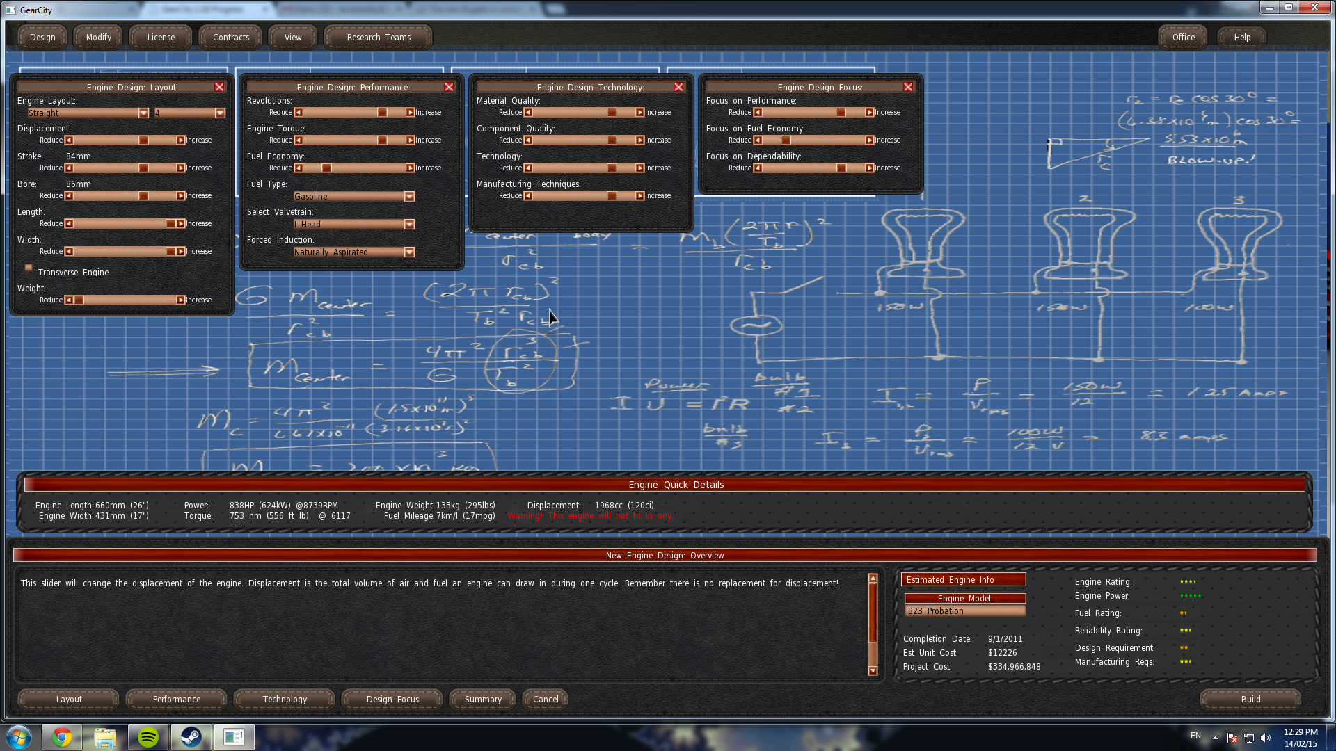 Hate to pile on but overall displacement slider seems to be broken. Built a single cylinder for a truck, pulled overall displacement all the way right and came up with a $800 engine. Returned it to mid and instead dragged stroke. Overall displacement jumps below bore immediately upon moving stroke and stays well behind. Then I pulled bore all the way right and overall sticks about mid. Displacement of the engine and power stats are the same as pulling the overall displacement slider all the way right but engine price is now $138. Big advantage producing a 'vomit inducing' 2hp for $138 in 1901 but not right.