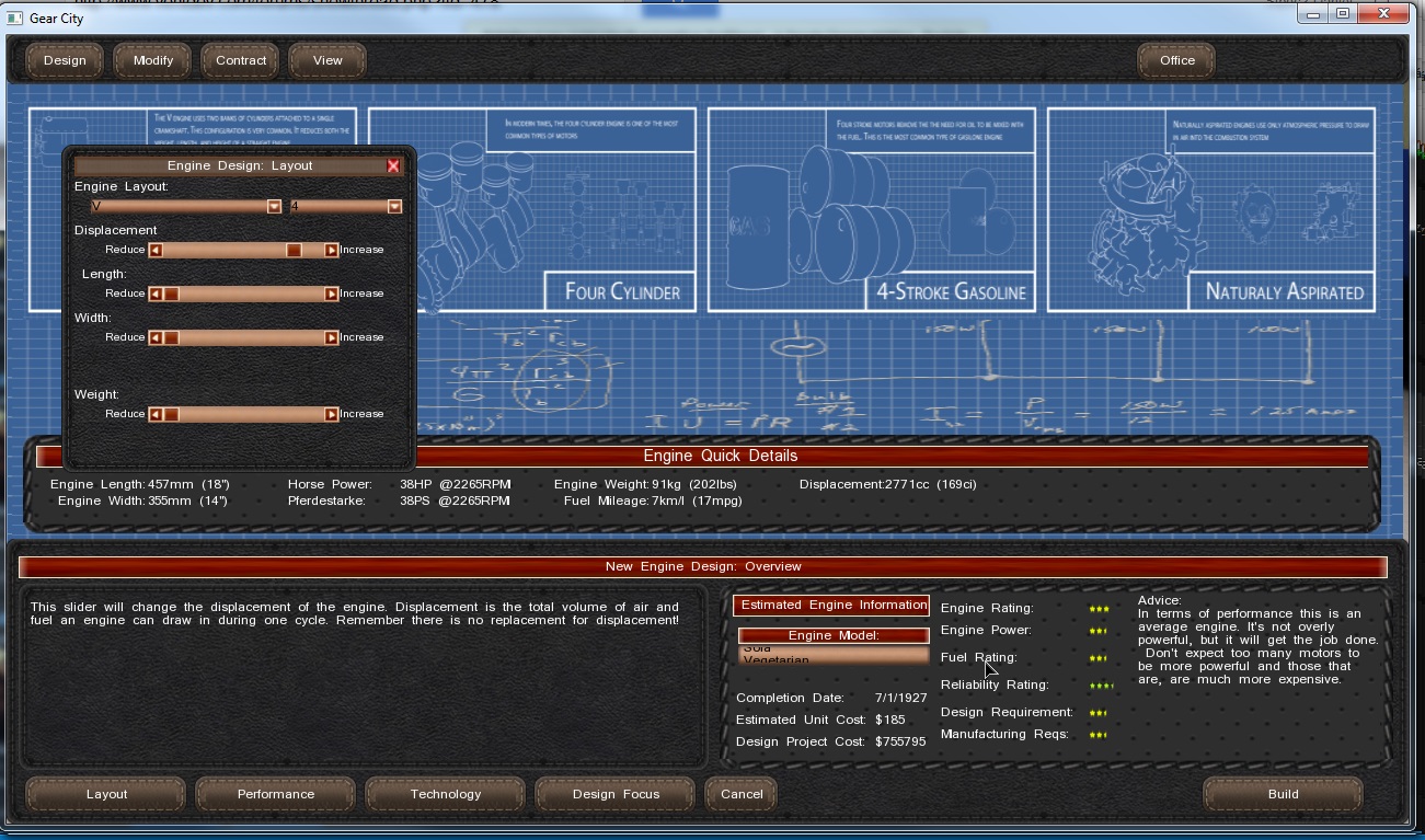 Quote:The very low engine size affects performance by contrast, the number of significant roll in this. This ratio should probably be pushed a bit. 3200ccm V4 32HP, while 2700ccm 104HP V16 (both without a compressor, using default settings)Age due to its high reliability of the engines should not reach such a high level in the same way as the innovative design either, because there is no experience with it.