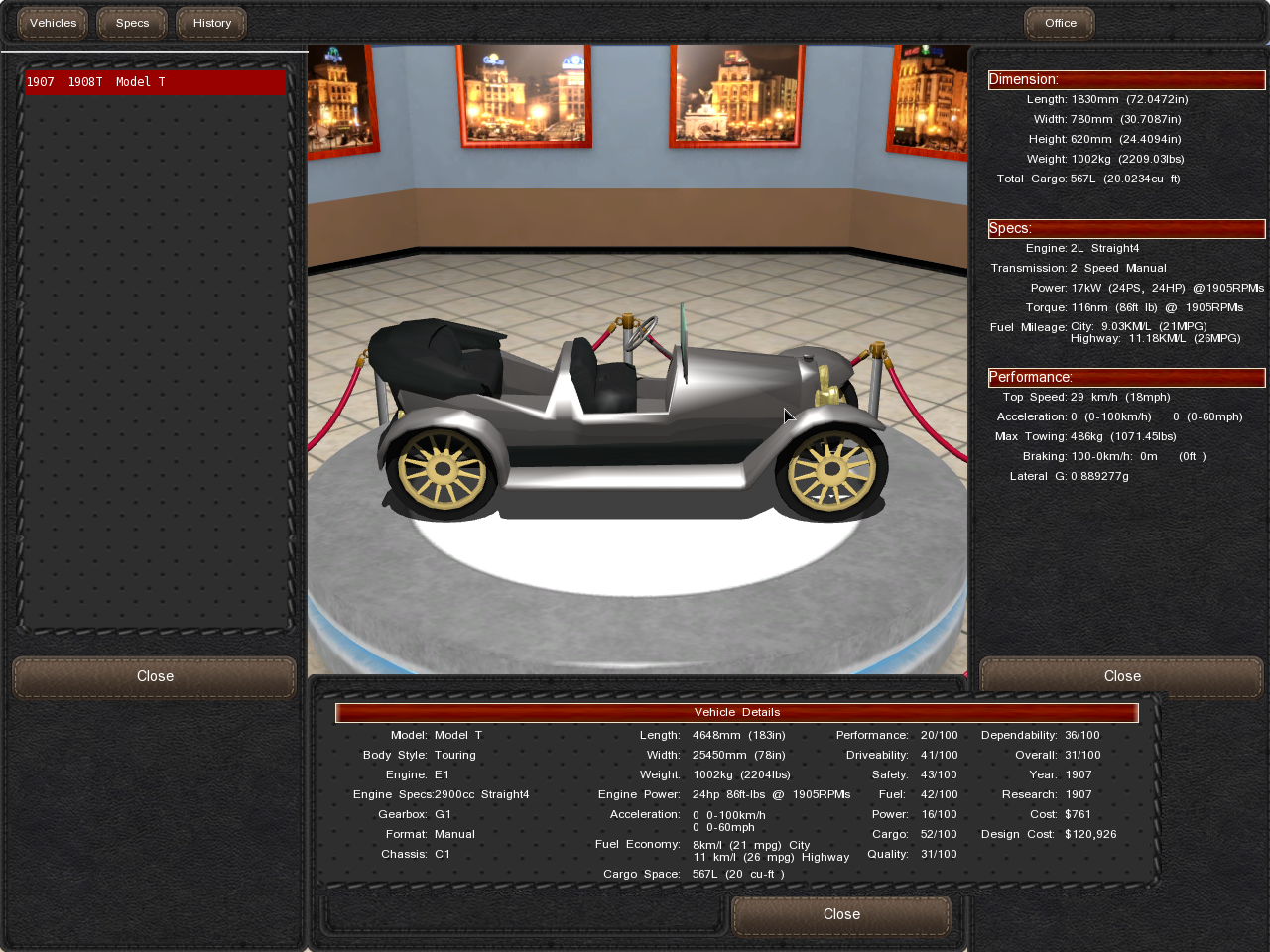Ive created this post with a save(so you can start in 1907) included to see if anyone can design something close to or the same as the Model T, one of the most successful vehicles in the period covered by the early part of Gearcity. Some specific suggestions on how its stats should look are at the end of the post.