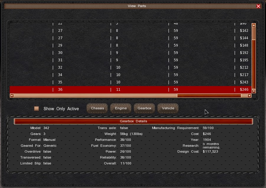 One would assume that researching so many gearboxes in such a short time frame should give the researchers a nice amount of knowledge which would raise the rating of every new designed gearbox, but nope, the overall rating of 11 seems to be set in stone. The only thing that changed significantly were the unit costs that rose by approximately 50% (first gearbox had a unit price of 165$ after release, the last one 246$).