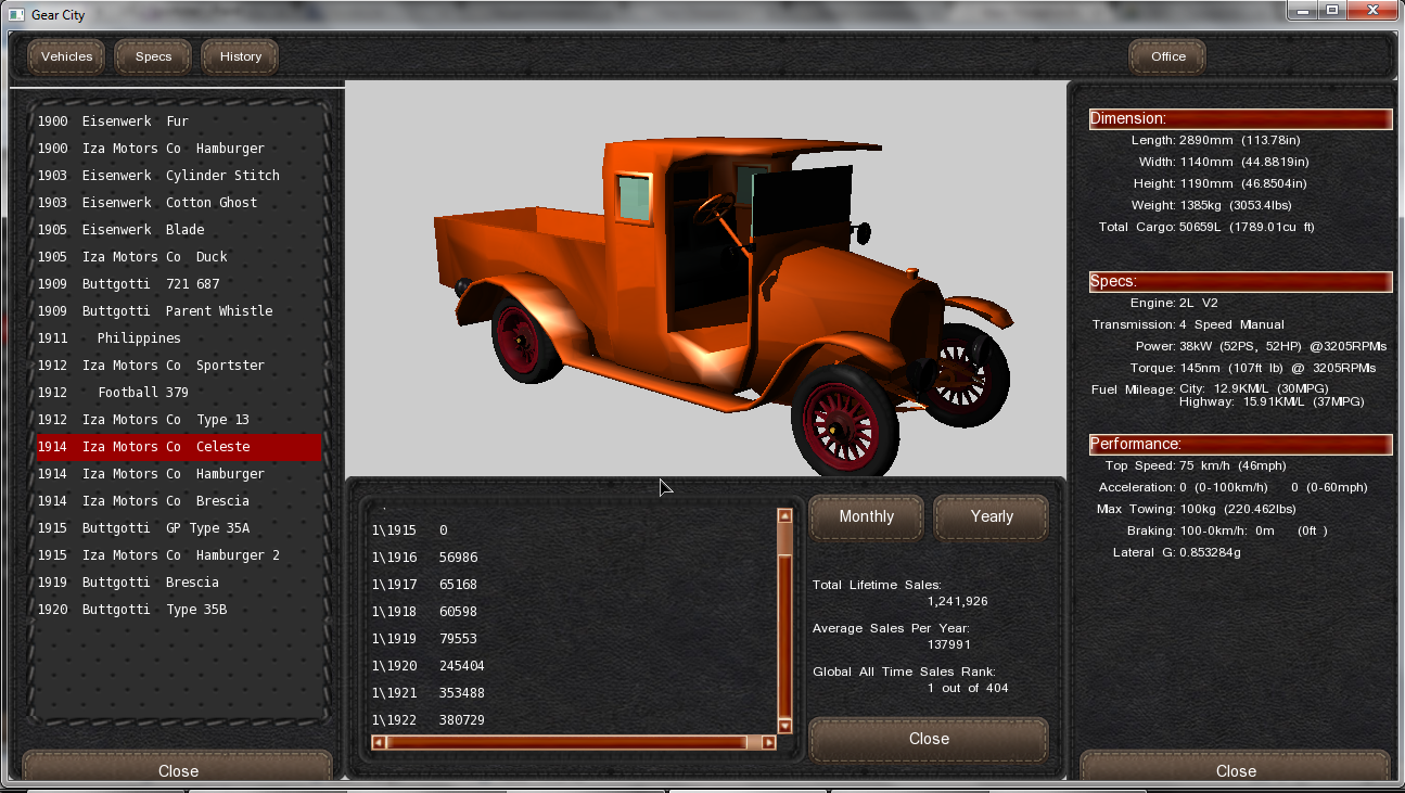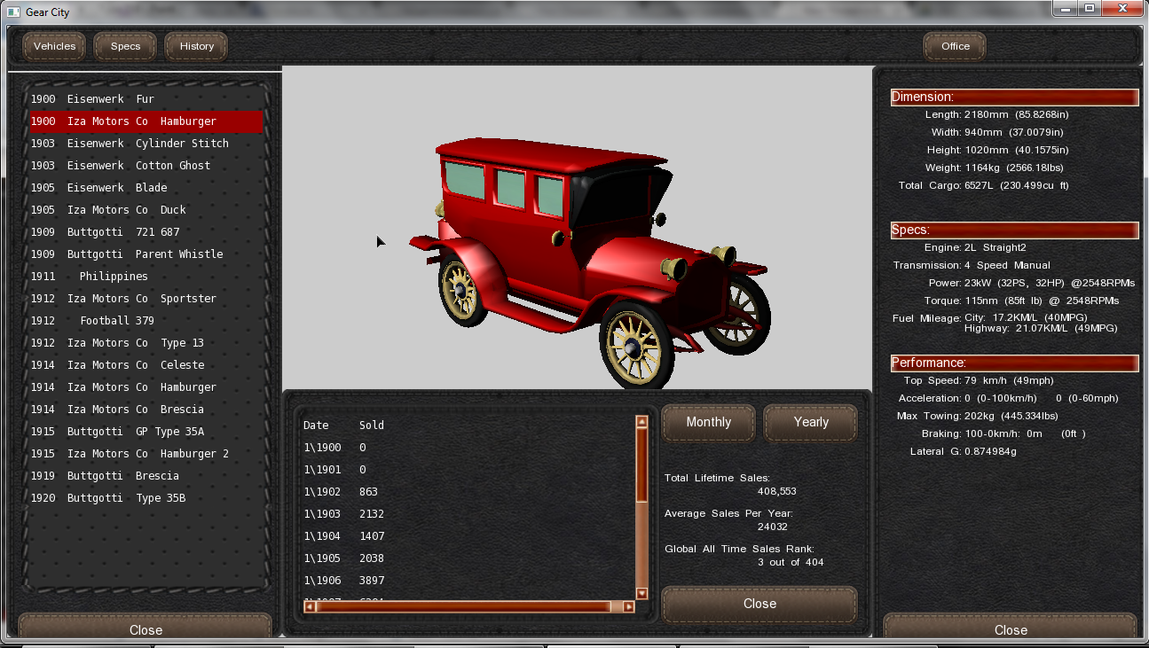 So, my first car was a Sedan, the 1900 Iza Motors Co Hamburger (Yeah, I know...) that had been available for production by the end of 1901.