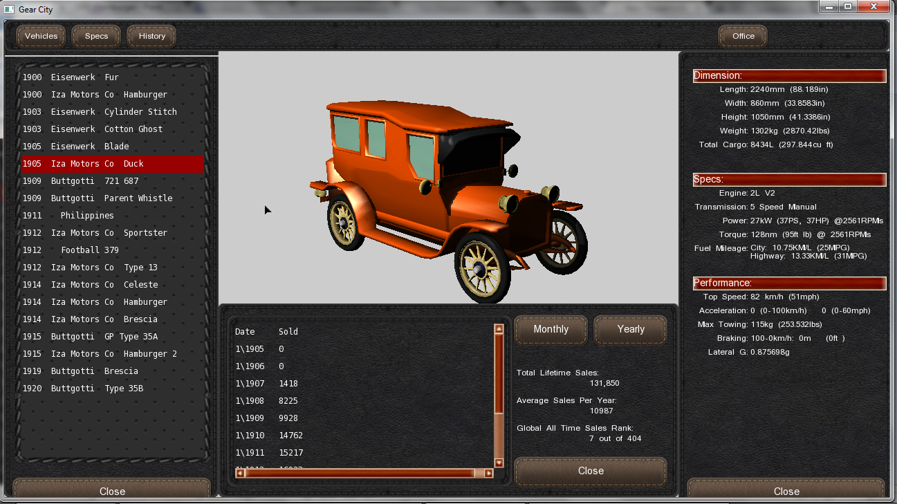 So I started to sell it at $ 2000 (or maybe 2500, I can't remember), but the price has been moving between 2500 and 1600 mostly... My technique here was to setup production, to check sales, then readjust production, and then, once I could not get any more sales, I adapted the price. As a matter of facts I also had to open several branches overtime to sell it, but I stayed within the US only! That car helped me making lots of money, and before launching the Duck, I could afford building a balanced factory in Boston. And I sold this car until 1915, year of the updated trim/model, the Hamburger 2...