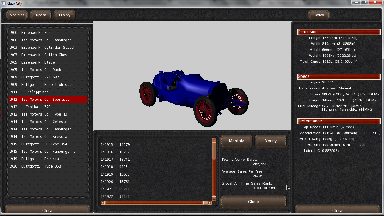 Then, I wanted to enter more seriously the market there, so I created the Brescia, and opened branches in France, England and Germany, as weel as a new high-everything factory in Genoa (Production costs almost negatives lol). Results were there, and I continued the same type of expansion I already have realized within the US market a few years before. For two years of selling, I produced and sold 250K of it with prices between 3000 at launch and 2500 nowadays... It became, in two years ONLY, the 6th sales record, not bad isn't it?