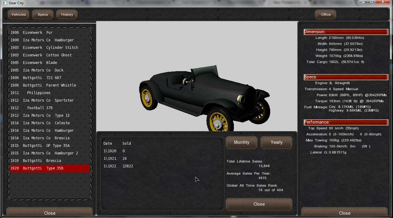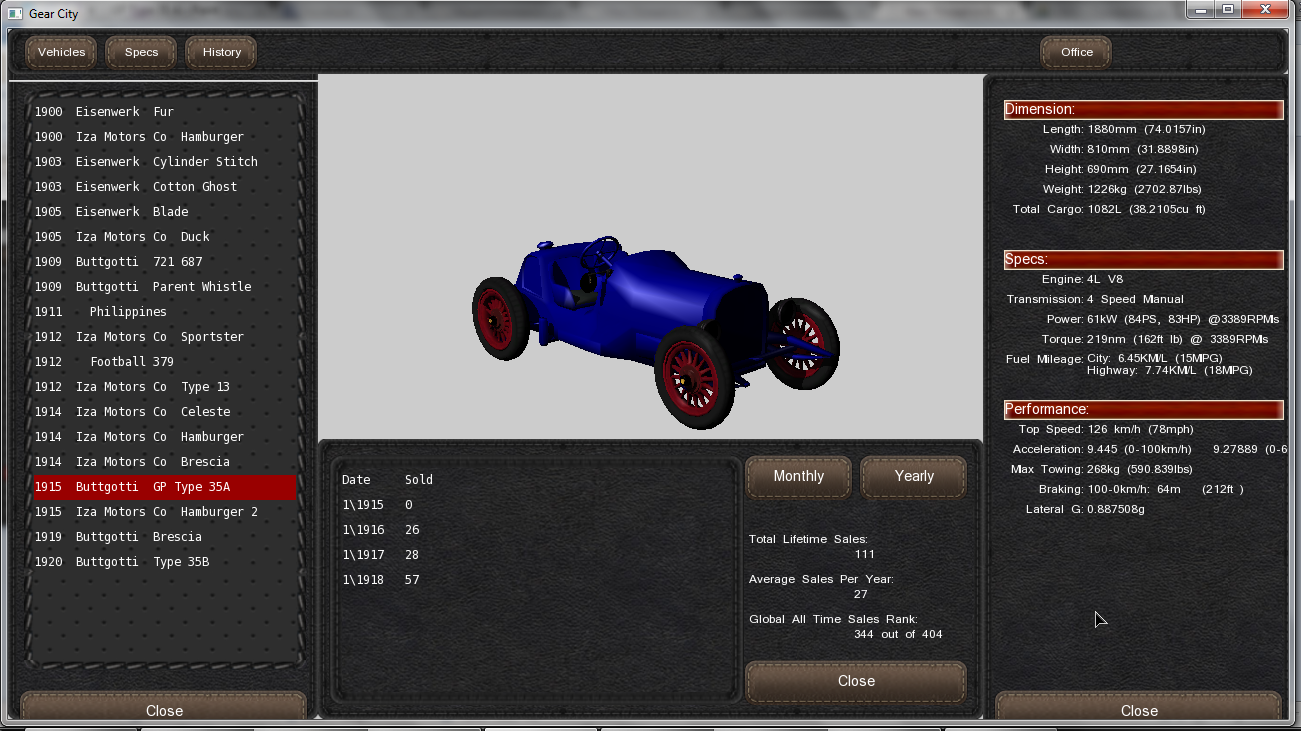 At this point, I planned to restart the company I bought several years before, in order to use it in Europe, and therefore, to expand. The Buttgotti company, which had been famous here in europe (And also which had won more races that ANY constructor so far). I had problems designing the car as I did not find how to create Buttgottis instead of IMC cars... But once I managed to do so (Thanks again Eric), I created first the GP Type 35A which was designed and sold only to be allowed to participate (and hopefully win) in racing... Well, it did not work out with the racing stuff, but I was low producing it (around 25) a month at a price of $ 5000 and well... It sold!