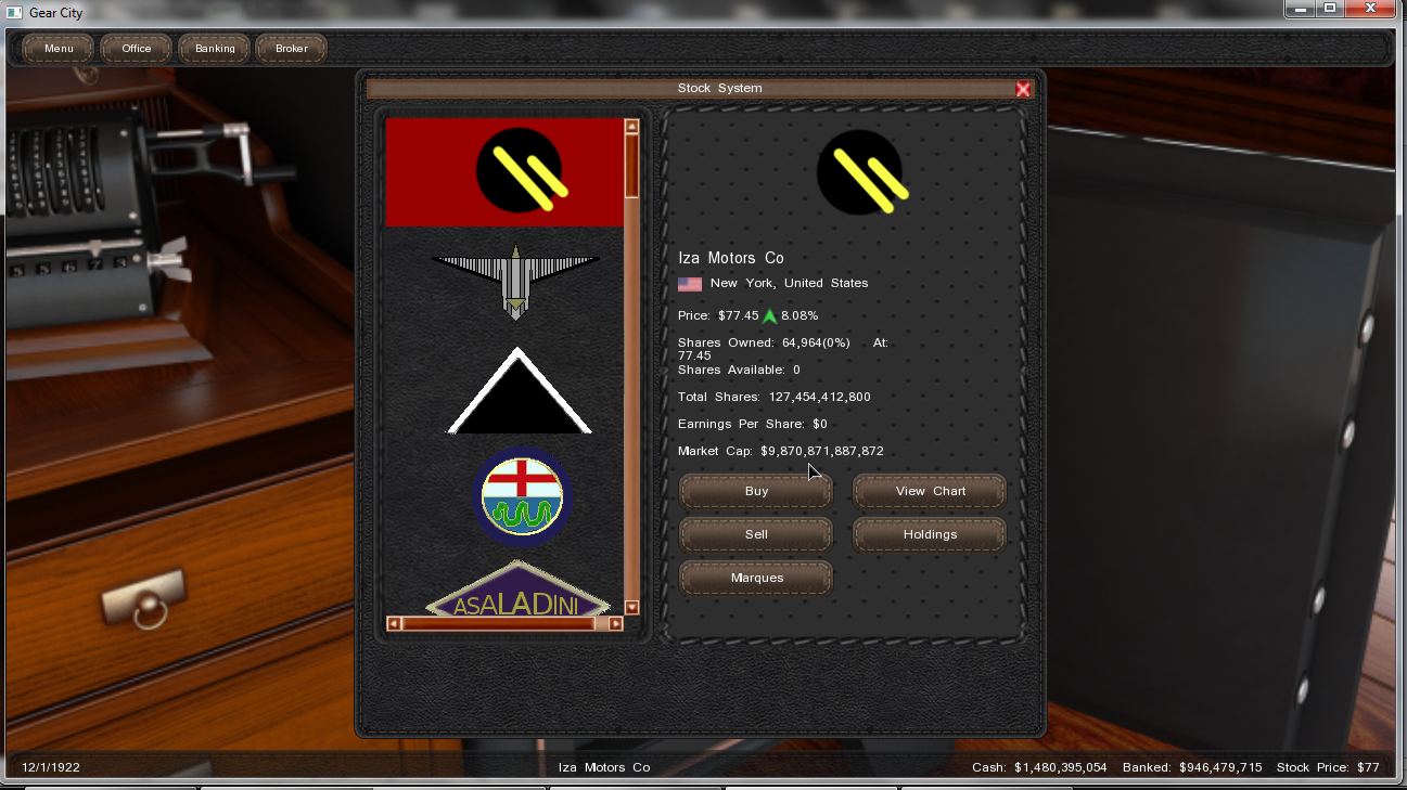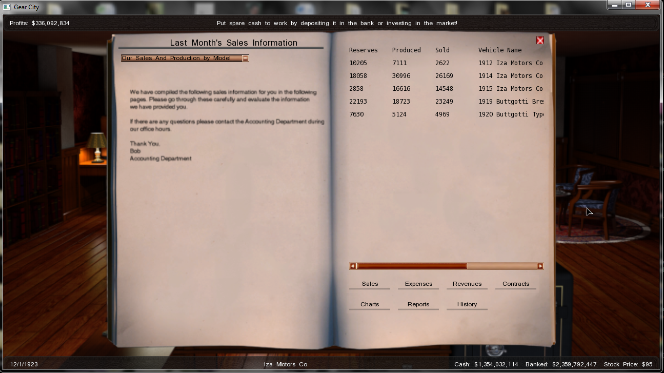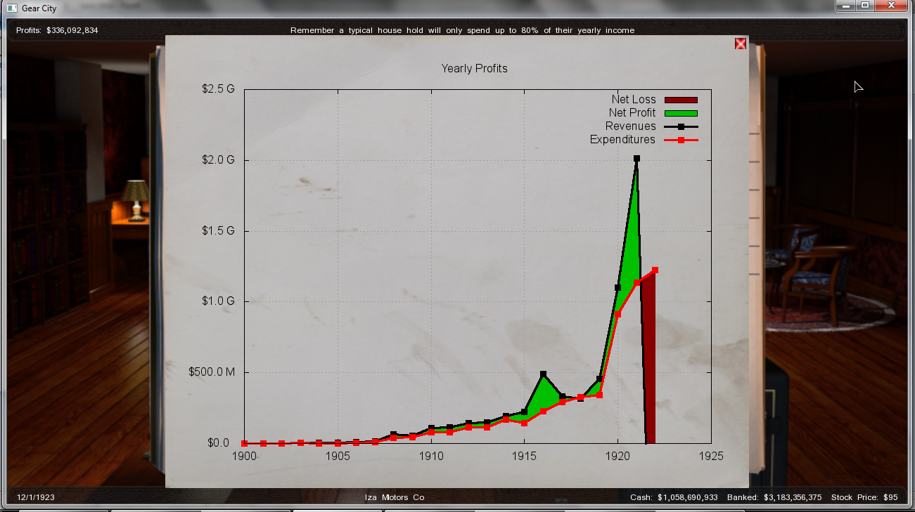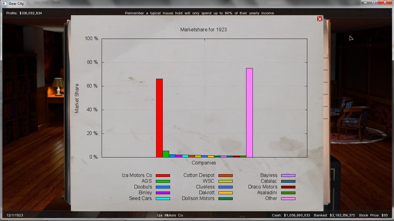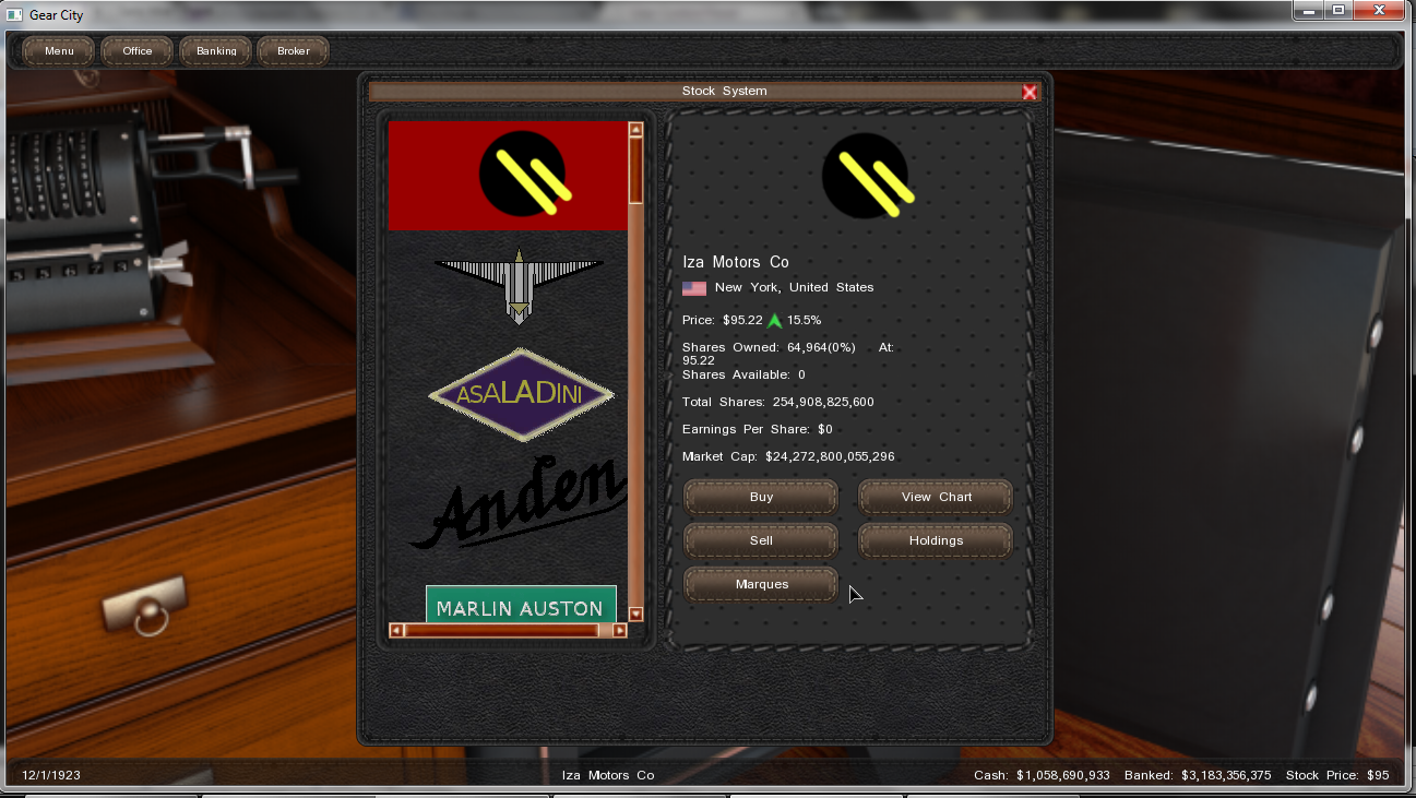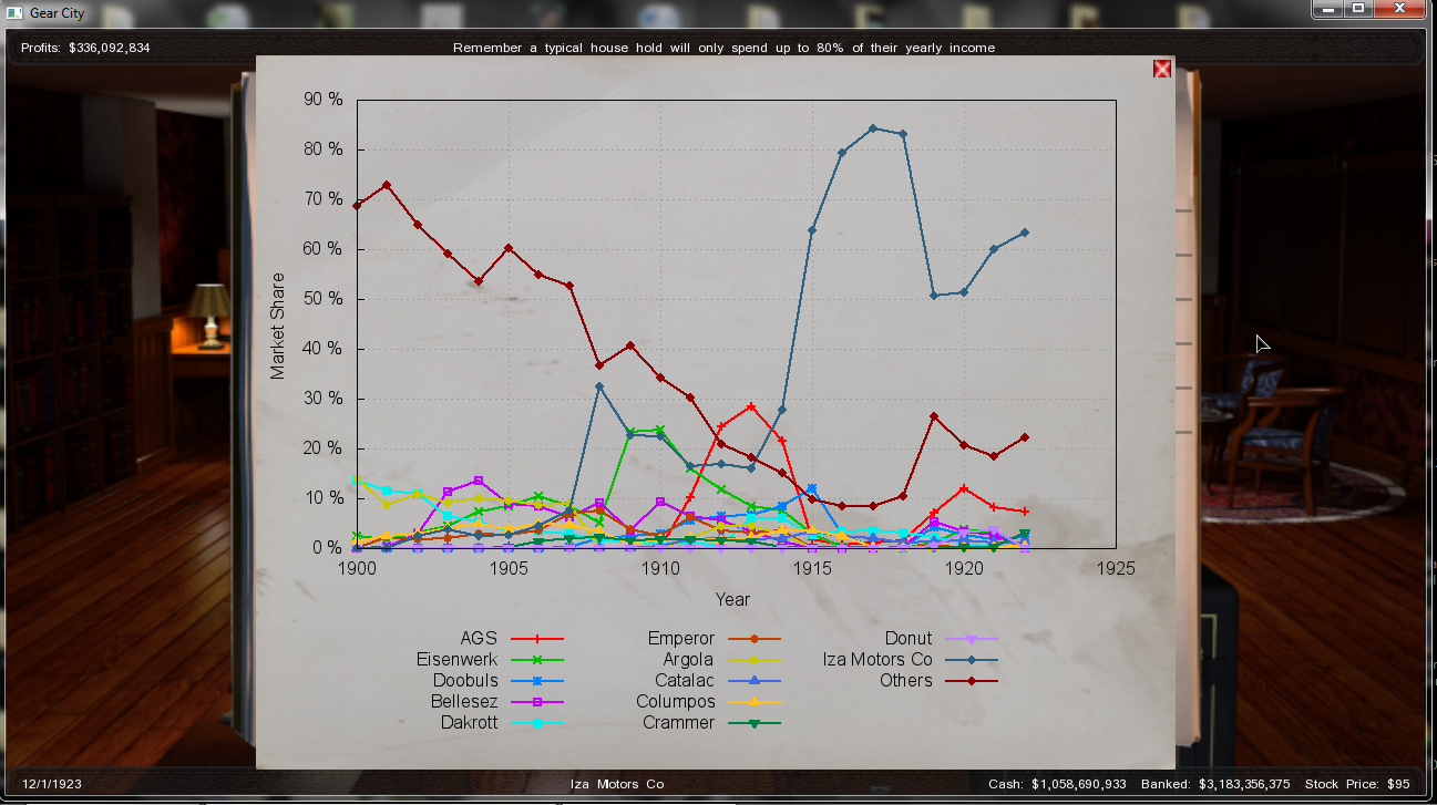 And... That's it... This is were I stand right, december 1923. Good news is I had planned to do this thread about 1921, so I took pictures of the december monthly sales and profits, as well as market capitalization. One thing I forgot to mention though, I launched an IPO in the very begining of the game, which led me to progressively loose my personal shares... But in the end, who cares? I'll try not to be on the stock market until I already have huge sales results, but I still don't know if this is some kinda related to one another (maybe I was that successful because of the IPO)...