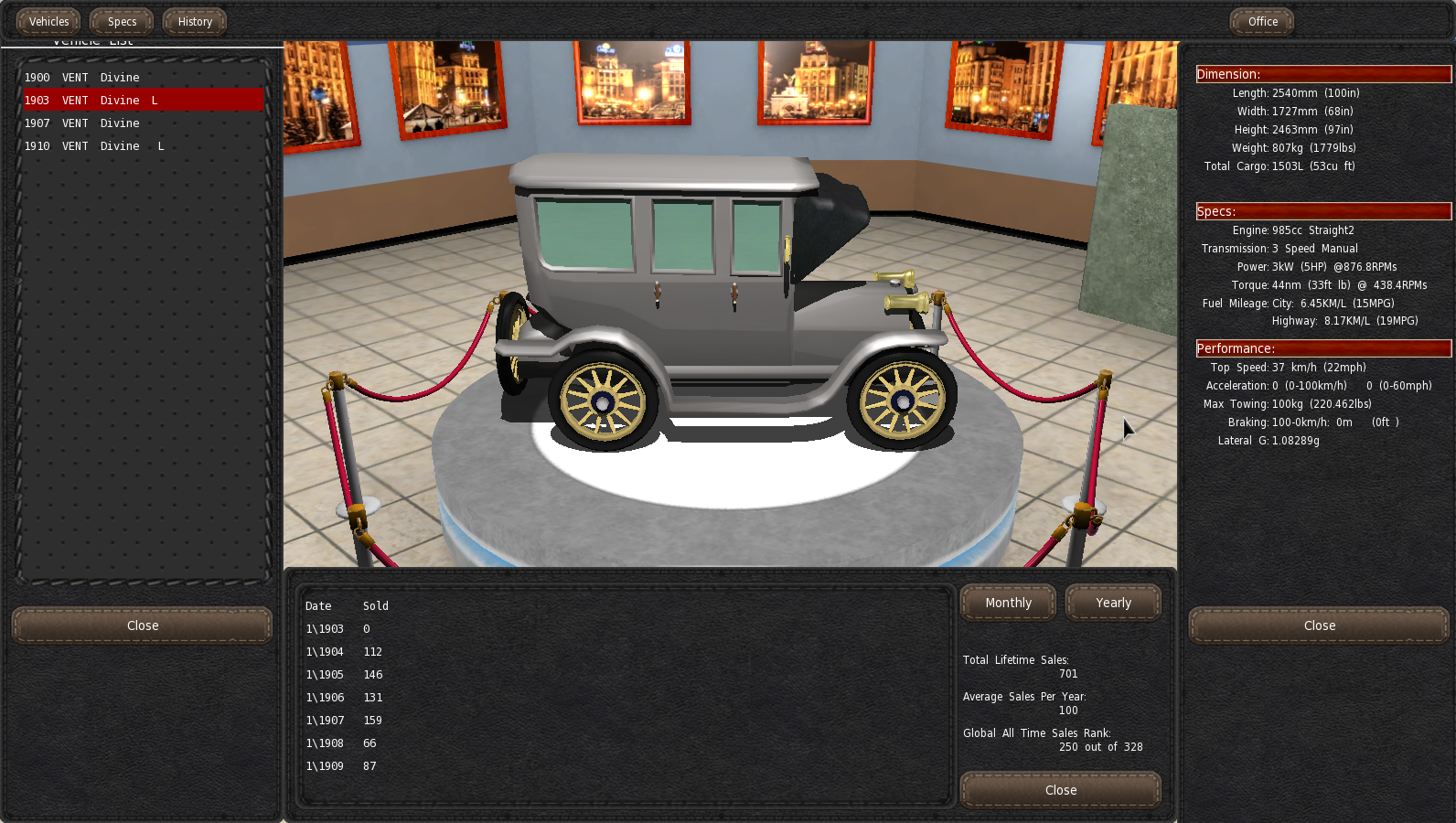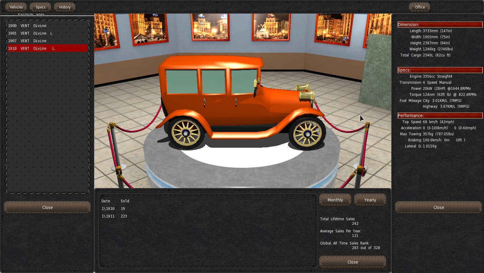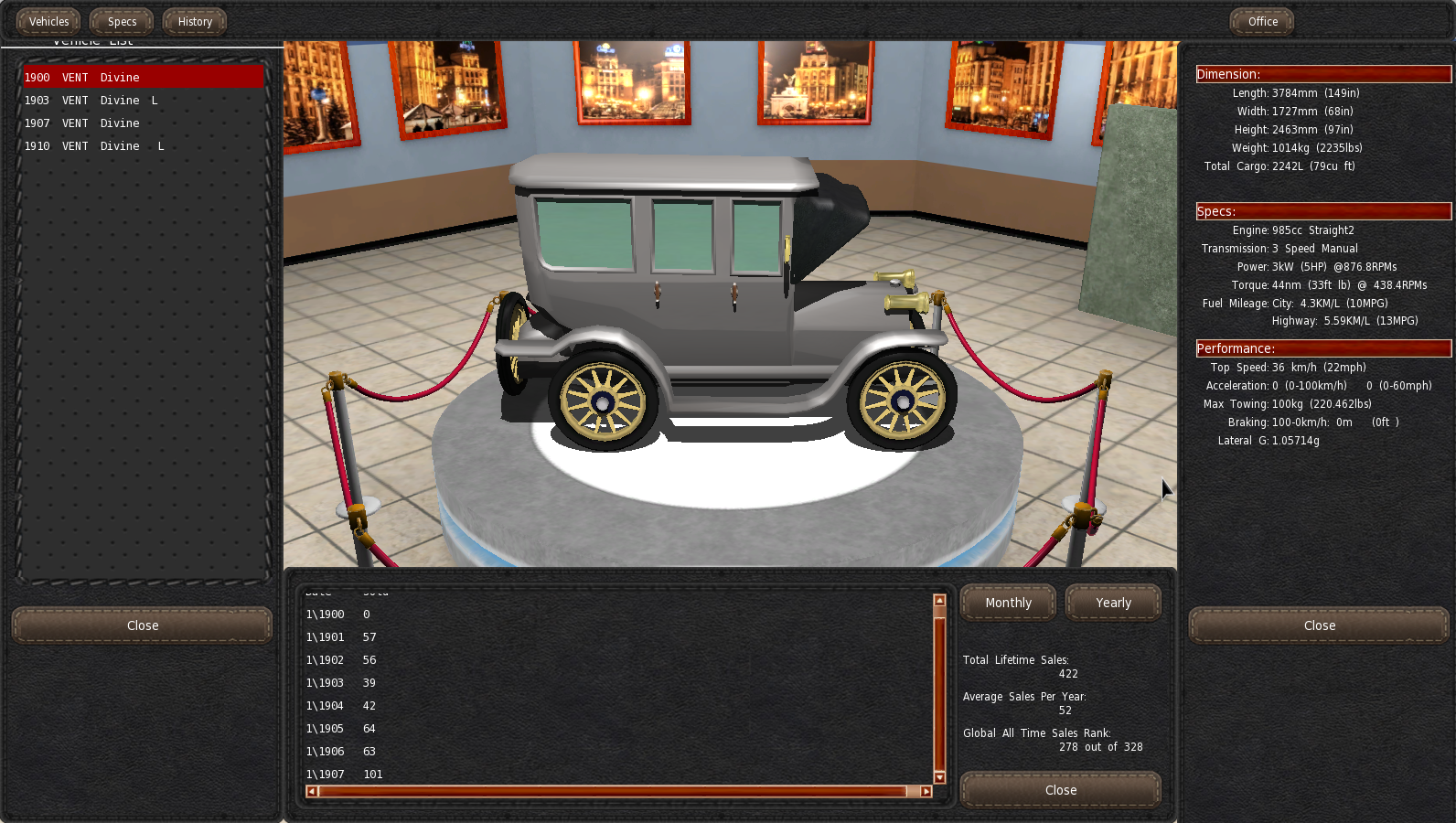 • My plan on diluting the market of Luxury Sedans worked. Going from 4 companies in New York to just 2. Assuming it stays like this I should limit my self to 1 model to prevent competition with my self. Time to move into other segments, after 1910 Divine L is finished I will work on a limo.