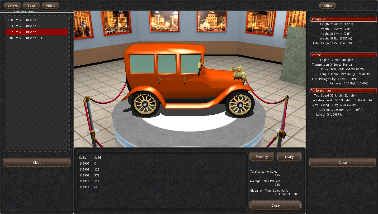• 1907 rolls around, still with the same two models, and remaining flat as far as revenues, I really need to make a new engine and vehicle.