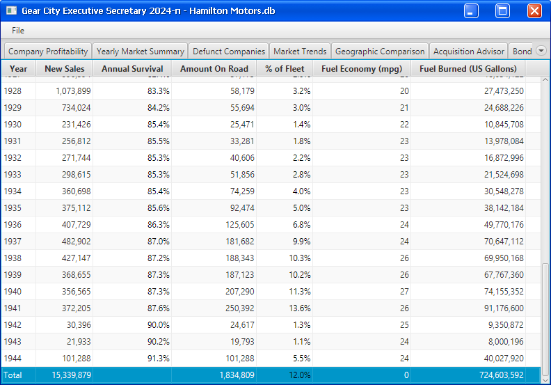 From there, there are lots of directions it can go.  Making fuel consumption more accurate, via historical data on mileage driven per year, which I've found dating back to 1936.  CO2 emissions, based on the miles driven, fuel economy, and type of fuel.  More general greenhouse gas emissions via approximation of N2O and CH4 (nitrous oxide and methane) emissions, thanks to the new emissions system in GearCity.  Preliminary testing shows CO2 will almost always be responsible for 95 - 98% of greenhouse gas emissions, but exceptionally dirty cars may push other contributors above 10%, such as a vehicle one of the AIs built with an emissions score of 68,000.  Another possibility is showing an evolution of the figures over time, rather than the current snapshot of the current year picture. We see 724 million gallons of fuel were burned in 1944, but don't yet have a good view of how that compared to 1940 (although, for context, 724 million gallons represents about 2 days' worth of consumption in the U.S. in 2022, and actual fuel consumption in the U.S. in 1944 was 11.1 billion gallons).